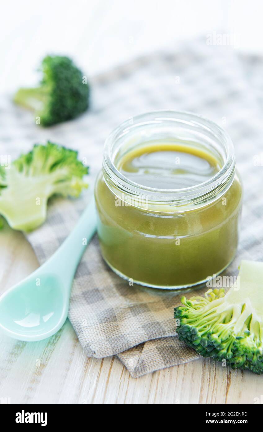 Baby Food Organic Green Broccoli Puree With Ingredients Mashed Broccoli And Peas Stock Photo Alamy